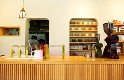 店内は青がアクセントとなるオシャレな空間で落ち着いた雰囲気、店主自ら厳選したコーヒー♪TAKEOUTできます。